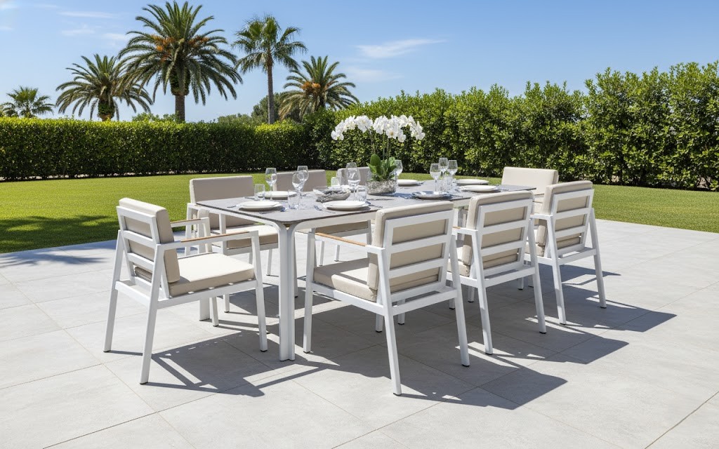 Diseñado para espacios exteriores y terrazas cubiertas, el Set MILETO ofrece una solución funcional, resistente y visualmente equilibrada, pensada para quienes buscan un mobiliario duradero, confortable y con una presencia estética cuidada.